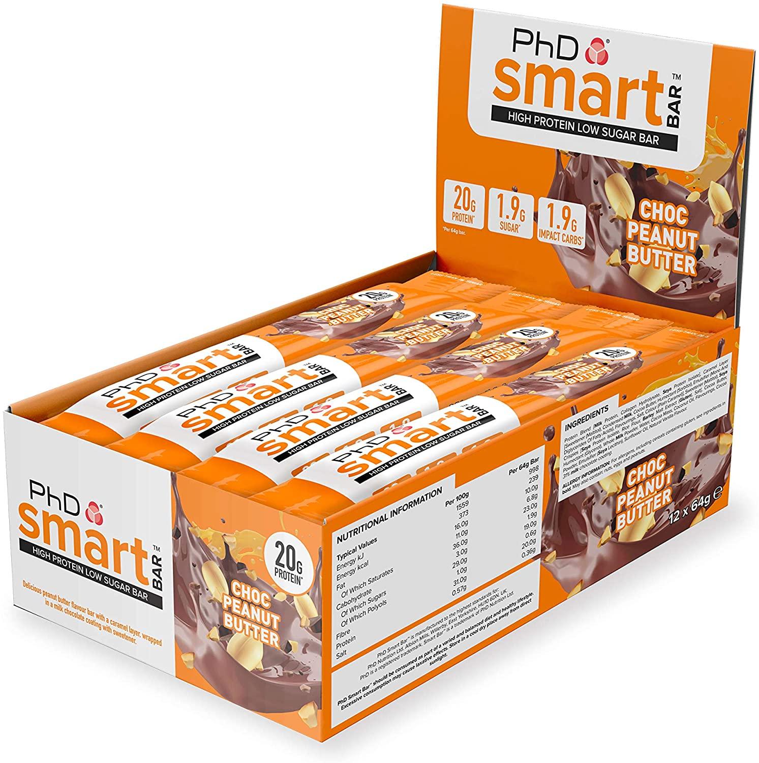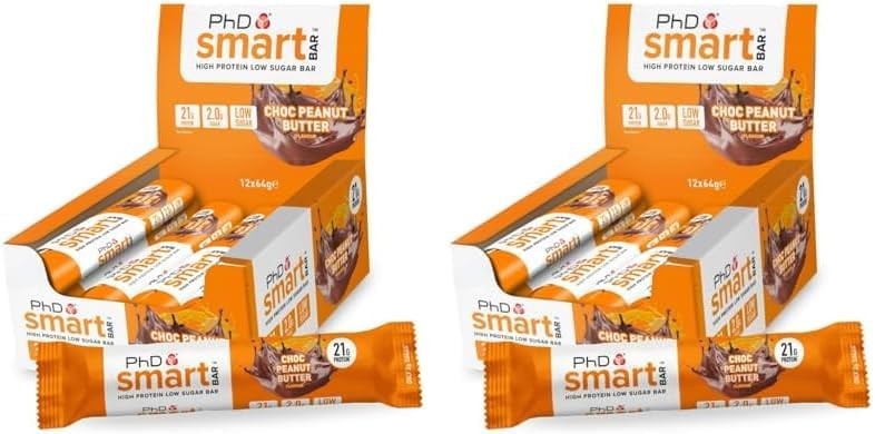 PhD Nutrition Smart Protein Bar, High Low Sugar Snacks, Chocolate Peanut Butter Flavour, 20 g of Protein, 64 Bar (12 Pack)