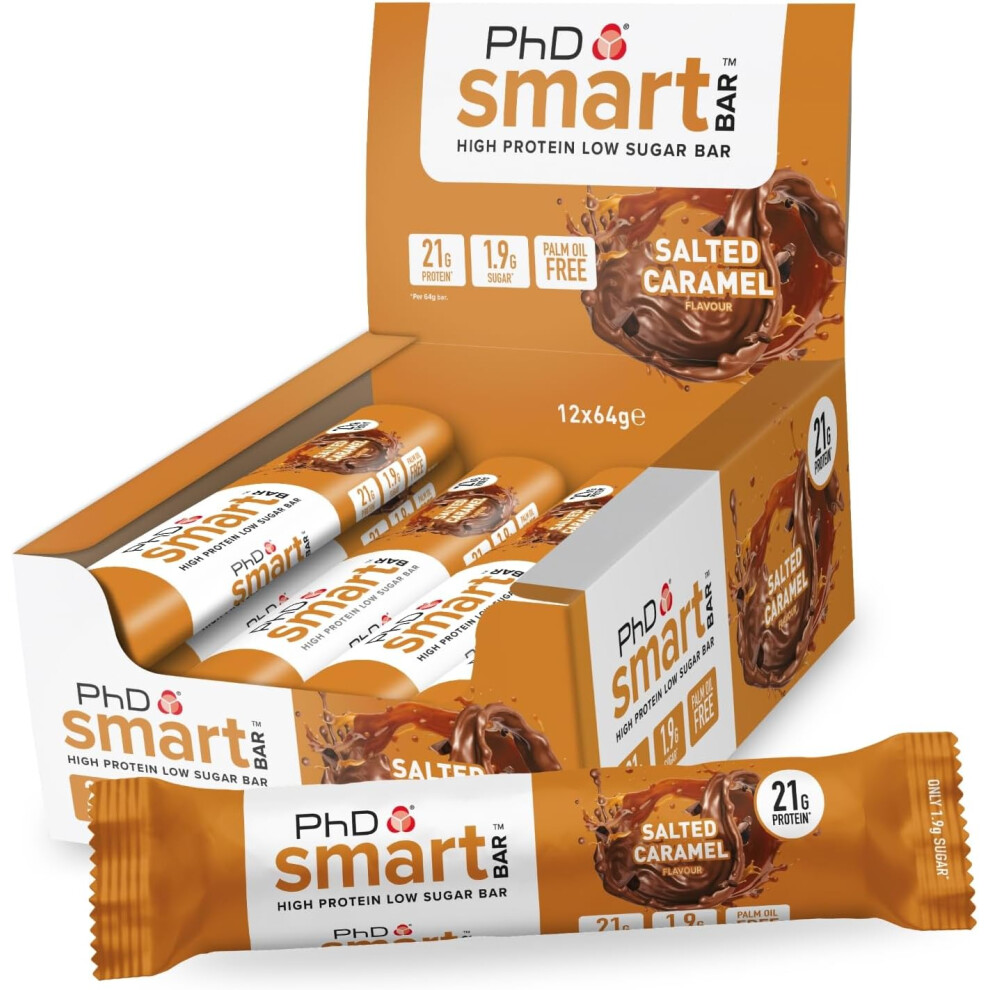 PhD Nutrition Smart Protein Bar Low Calorie, Nutritional Protein Snacks, High Protein Low Sugar,Salted Caramel Flavour 20g Protein 64g Bar 12 Pack
