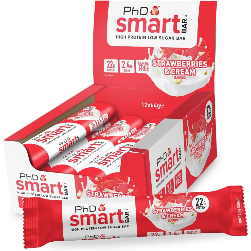 PhD Nutrition Smart Protein Bar Low Calorie, Nutritional Protein Bars / Protein Snacks, Strawberries and 20g of Protein, 64g Bar (12 Pack)