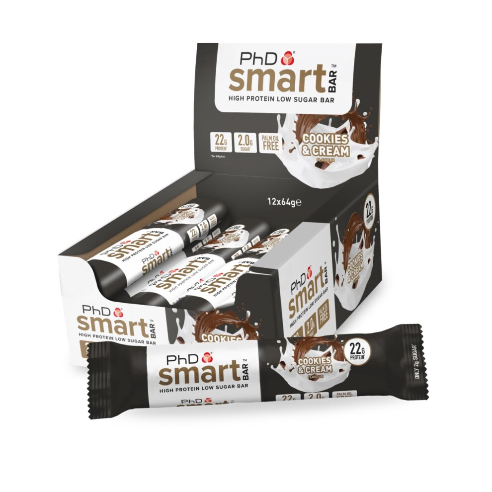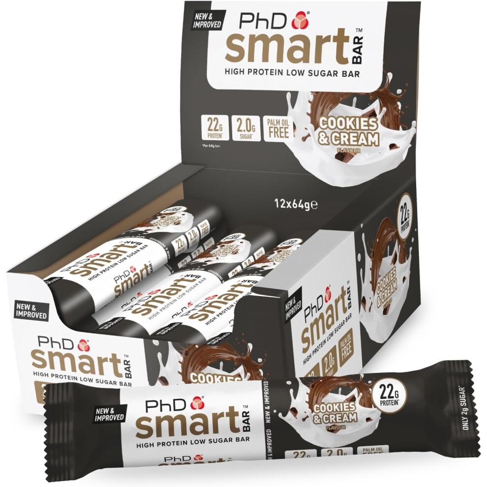 PhD Nutrition Smart Protein Bar, High Protein Low Sugar Protein Snacks, Cookies and Cream Flavour, 20 g of Protein, 64 g Bar (12 Pack)