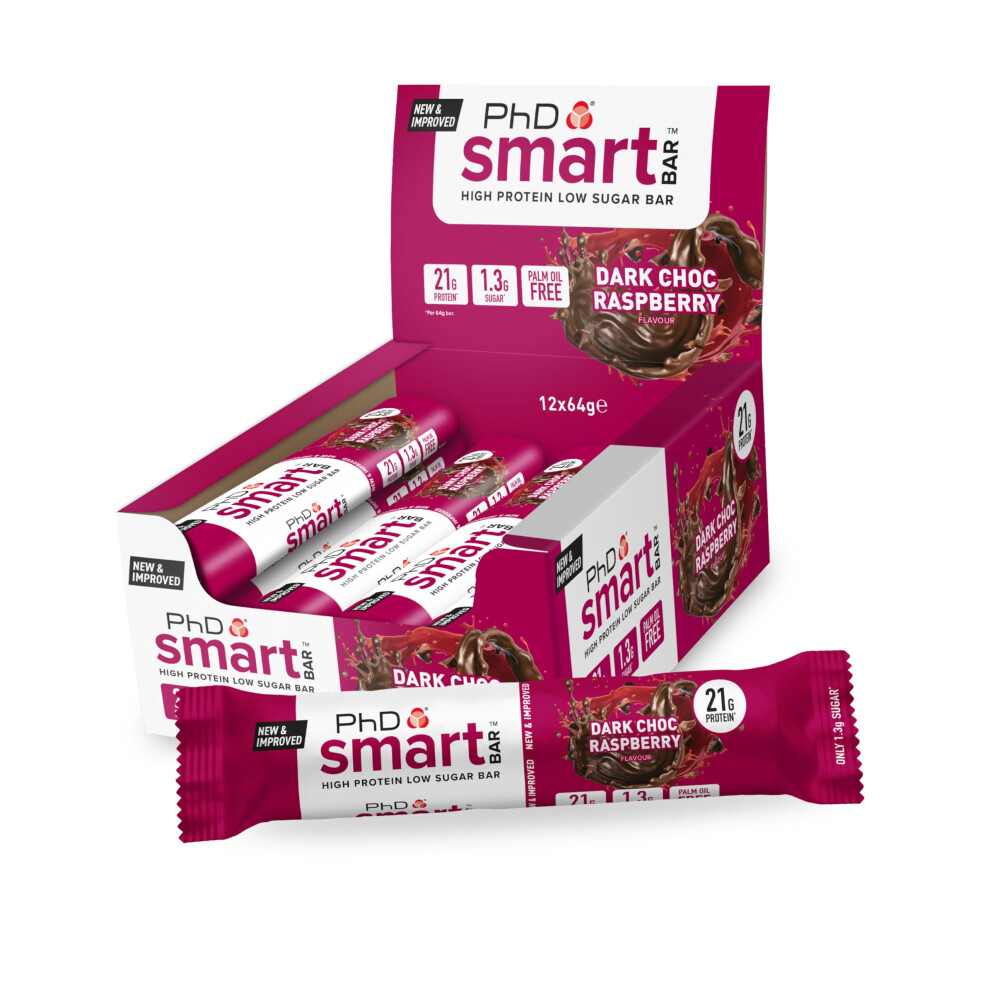 PhD Nutrition Smart Protein Bar, High Protein Low Sugar Protein Snacks, Dark Chocolate Raspberry Flavour, 20 g of Protein, 64 g Bar (12 Pack)