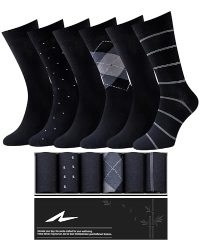 Niorasen 6 Pairs Bamboo Mens Socks, Comfortable Soft Top Crew Socks, Breathable Smart Classic Dress Sock with Gift Box for Everyday Business Casual 3Black+3Pattern Black 5-9