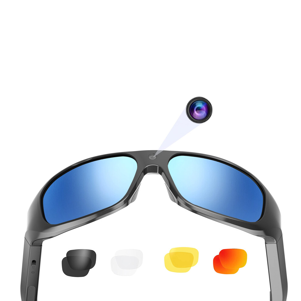 OhO 256GB Camera Glasses,24m Resolution H.265 1080P Smart Glasses with UV400 Sunglasses Lenses for Outdoor Sports,Unisex, Black Frame - Blue Lens, 256GB