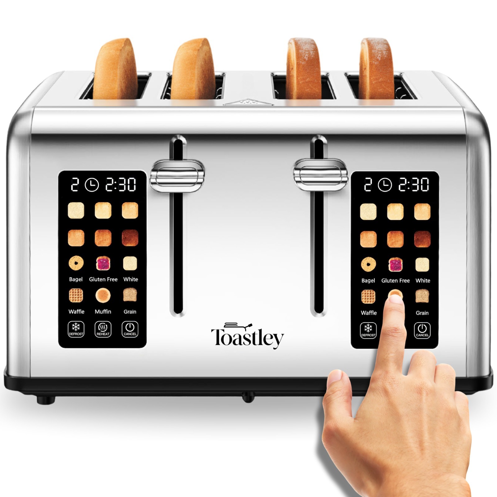 Toastley Smart Toaster 4 Slice, Wide Slots, Dual Screens, Digital Timer, Silver