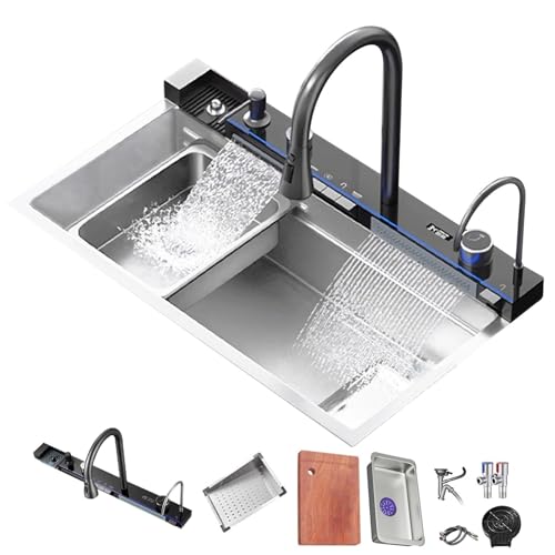 Smart Kitchen Sink Two Waterfalls Stainless Steel Sink Vegetable Wash Basin With Pull-out Faucet(75 * 46cm)
