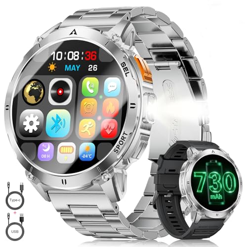Smart Watch for Men 730mAh with Bluetooth Call, 1.62" AMOLED LED Flashlight Smartwatch, 110+ Sports Mode Fitness Tracker, SpO2/Blood Pressure/Heart Rate/Sleep Monitor for Android iOS Silver