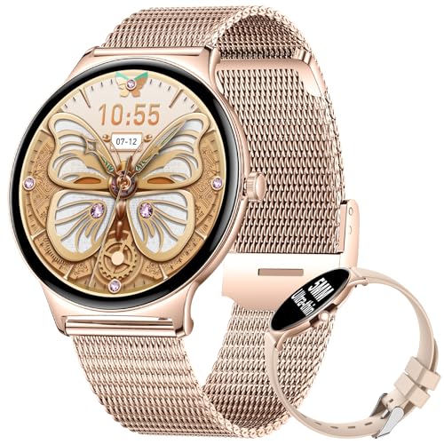 Women's Smart Watch Bluetooth Phone Calls for Android iOS 100+ Sport Fitness Tracker 1.32" HD Female Smartwatch Heart Rate Sleep Monitor Diamond Ladies Smartwatch Rose Gold Steel,2 Watch Straps