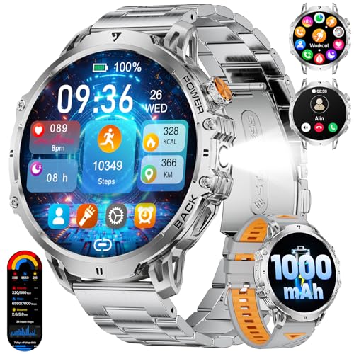 BENYAR SMART-Smart Watch for Men 1000mAh Battery, 1,85" HD Large Screen Fitness Watch with LED Flashlight/Bluetooth Call, 110+Sports Modes Pedometer with Step Counter/Calories IP68 Waterproof, Silver
