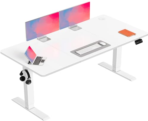 Precision Synergie Electric Standing Desk, 160x60cm Height Adjustable Desks with 3 Power Outlets & 2 USB Ports and 3 Memory Smart Panels Home Office Desk with Headphone Hook and Splice Board(White)