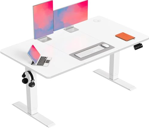 Claiks Standing Desk 140x60cm Height Adjustable Desk with Hooks and Memory Smart Pannel, Home Office Electric Standing Desk with Splice Board, White Frame/White Top