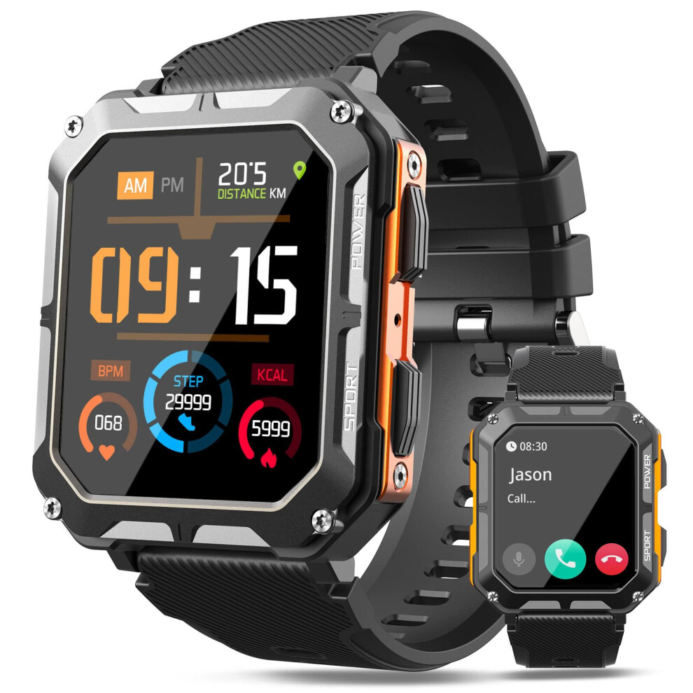Military Smart Watch for Men 1.81' Bluetooth Call Fitness Tracker IP68 Waterproof Orange Sports Smartwatch for Android and iPhone