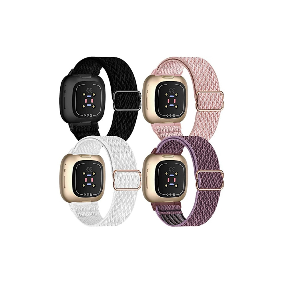 4-Pack Adjustable Elastic Nylon Band Compatible with Fitbit Versa 3 / Fitbit Sense, Sports Wristband for Smartwatch (Black/Rose Pink/White/S{F2})
