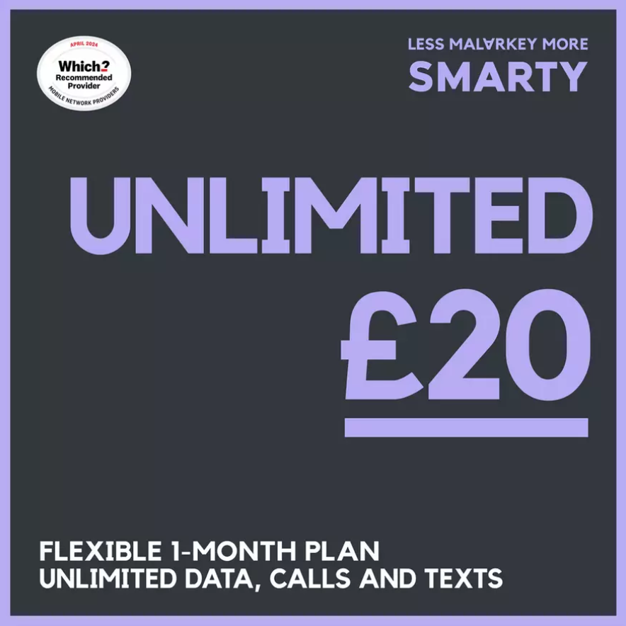 SMARTY UK sim card, UNLIMITED mins/texts, 40GB data for £10/month. PAY AS YOU GO