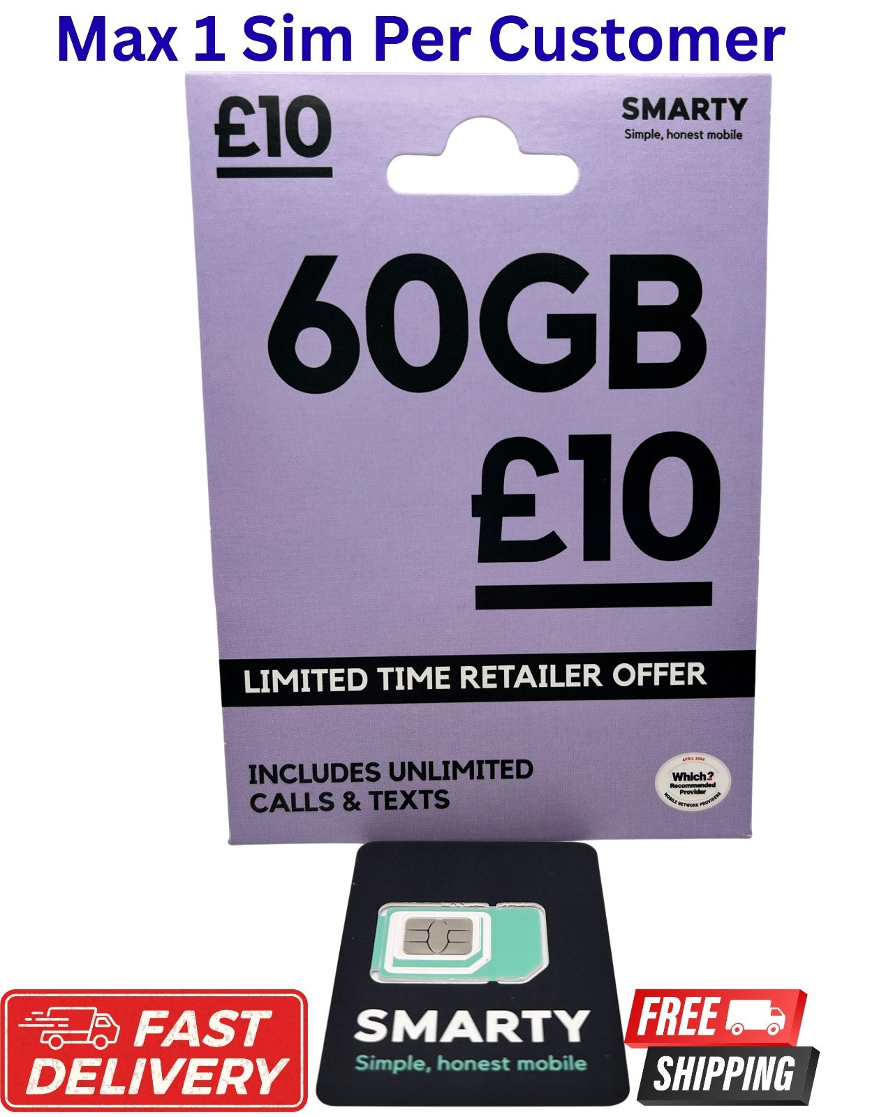 1 x NEW LATEST OFFER Smarty UK sim card 60GB-£10- 5G 4G WIFI- UNLIMITED