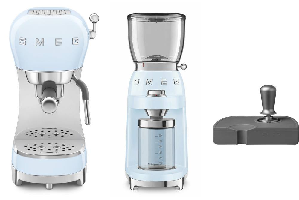 Smeg ECF02, CGF11, ECTS01 Coffee Grinder, Espresso Machine and Tamping Set in Pale Blue
