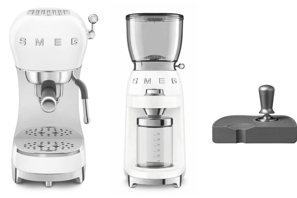 Smeg ECF02, CGF11, ECTS01 Coffee Grinder, Espresso Machine and Tamping Set in White
