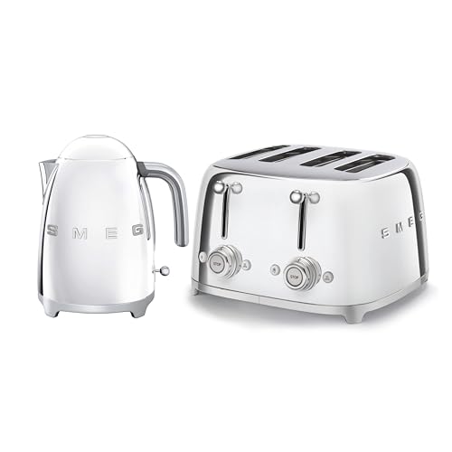 Smeg 50’s Style Retro Range Breakfast Set, 1.7L 3000W Kettle and Multi-Functional Control 4-Slice 2000W Toaster, Polished Stainless Steel, KLF03SSUK/ TSF03SSUK