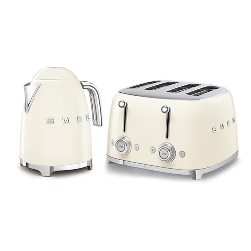 Smeg 50’s Style Retro Range Breakfast Set, 1.7L 3000W Kettle and Multi-Functional Control 4-Slice 2000W Toaster, Cream, KLF03CRUK/ TSF03CRUK