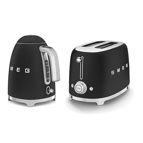 Smeg 50’s Style Retro Range Breakfast Set, 1.7L 3000W Kettle and Multi-Functional Control 2-Slice 950W Toaster, Matte Black, KLF03BLMUK/ TSF01BLMUK