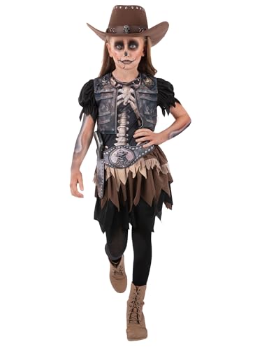 Smiffys Skeleton Cowgirl Costume for Girls, Spooky Western Halloween Outfit with Skeleton Print Dress and Holster Belt, Wild West Fancy Dress for Kids Age 7-9