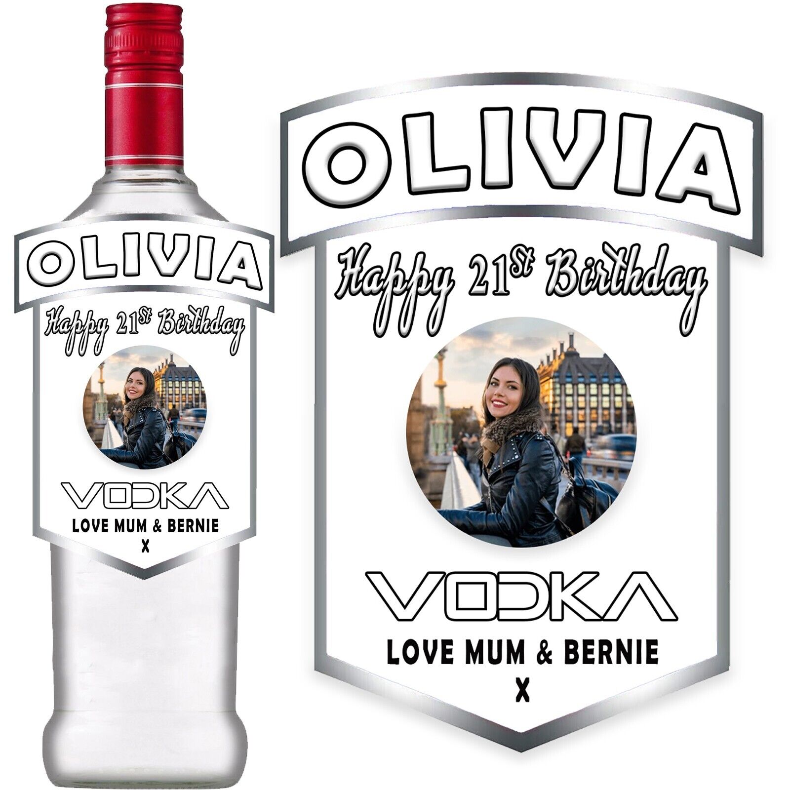 Photo Personalised White Bottle Label for Smirnoff Vodka Birthday Anniversary