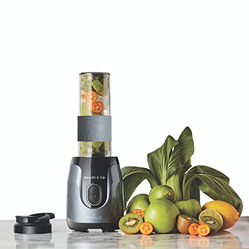 Karaca Blendfit Go Personal Smoothie Blender, 2x 600ml Bottle, Leak-Proof Bottle and Storage Lid, Ice Crushing Feature, Non-Slip Feet, Stainless Steel Blades, Silicone Handle, Anthracite