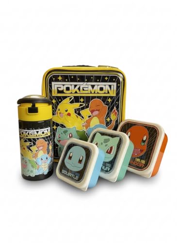 Pokémon 5-Piece Lunch Set | Kids Lunch Bag, 450ml Lockable Water Bottle | 3 Nesting Snack Boxes Different Sizes Featuring Chamander, Bulbasaur & Squirtle | School Lunch Kit for Kids