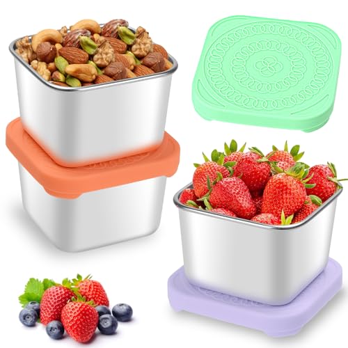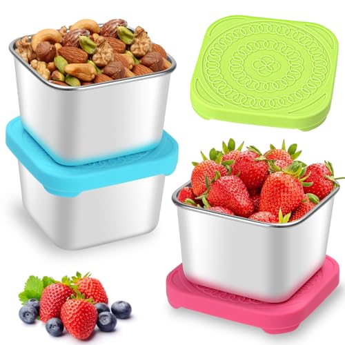 3Pcs Small Food Containers To Go Leakproof Food Storage Containers Stackable Snack boxes Tubs Reusable Metal Stainless Steel Storage Containers with Silicone Lids for kids,School,Travel|BPA-Free(6Oz)