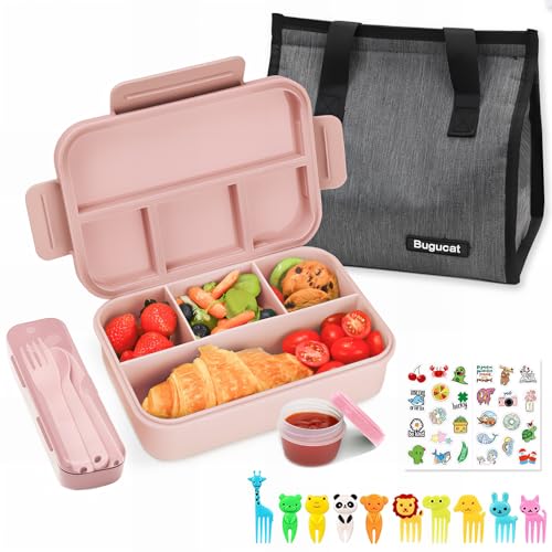 Bugucat Leak-Proof Bento Box with 4 Compartments, Kids & Adult Lunch Box with Cutlery, Snack Boxes for School, Kindergarten, Office - Pink, 1300ML