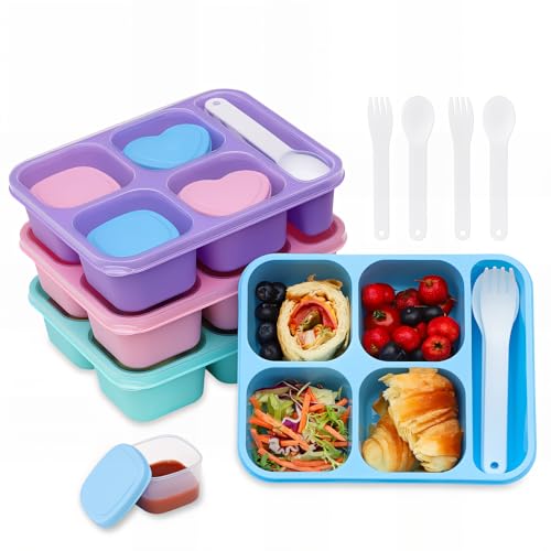 4Pcs Snack Boxes with Compartments, Containers for Kids and Adults, 4 Compartments Bento Lunch Boxes, Microwave Safety, Reusable Snack Pack Containers for School Work Travel with Spoons & Forks