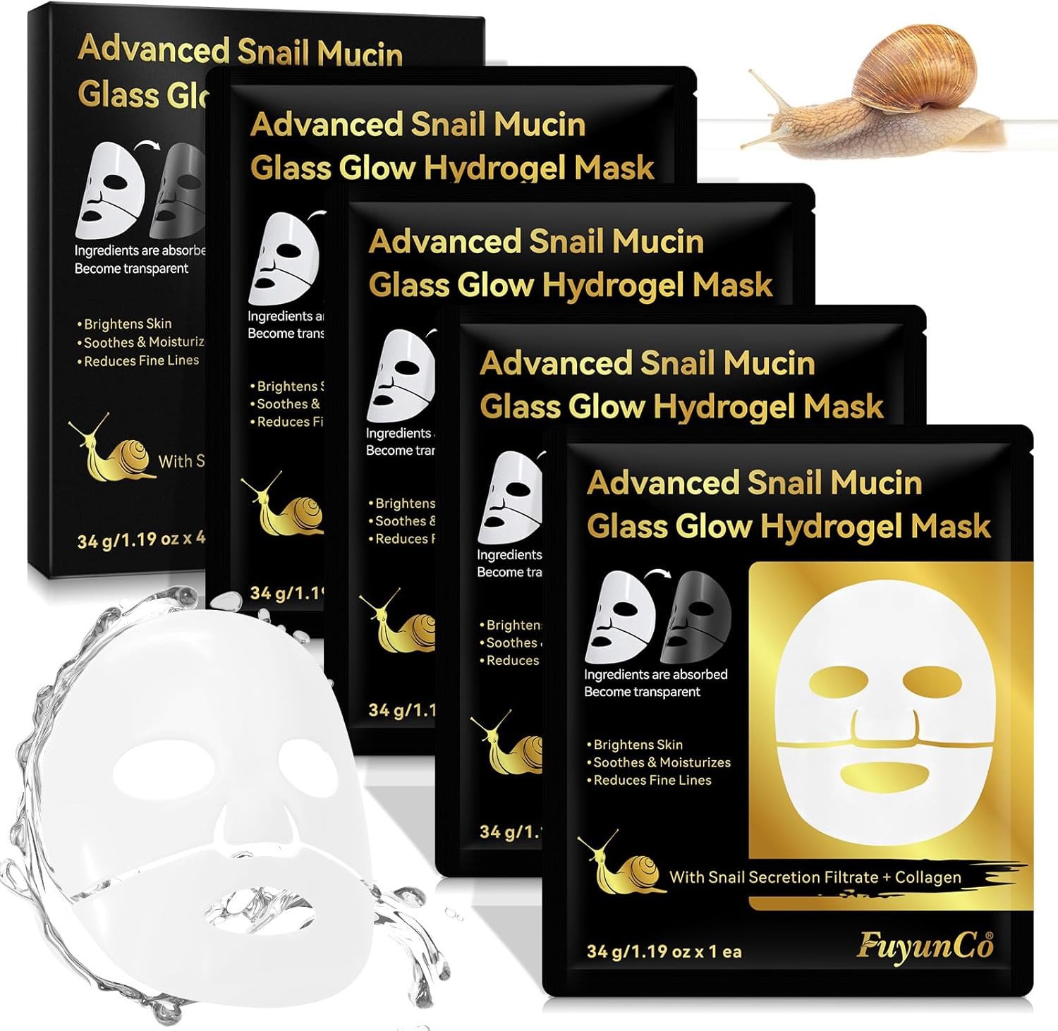 Advanced Snail Mucin Glass Glow Hydrogel Face Masks, 4Pcs Collagen Face Mask, Sn