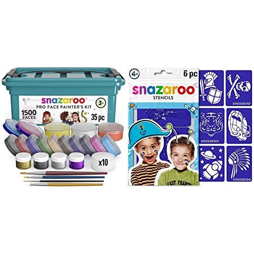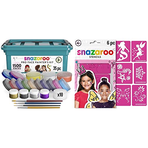Snazaroo Professional Face Paint Kit for Kids and Adults, 35 Colours, 11pcs, Brushes, Glitter Gels, Sponges, Guide & SZ1198014 Re-usable Face Paint Stencils for Girls-6 Pcs, Pink, Unit