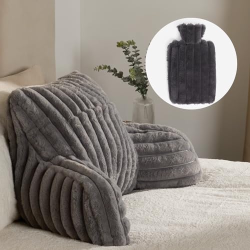 OHS Reading Pillows with Hot Water Bottle Included, Ribbed Faux Fur Back Support Cushion Soft Cosy Snuggle Cushion with Arms Gaming Pillow for Bed, Grey