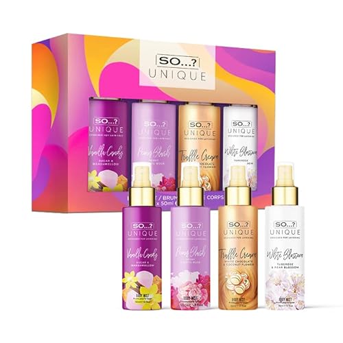 So…? Unique Mini Mist Womens Gift Set with Vanilla Candy, Sweet Pea, Truffle Cream, & White Blossom, Body Mist Fragrance Spray Set (4 x 50ml.)