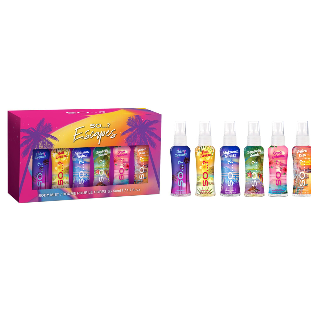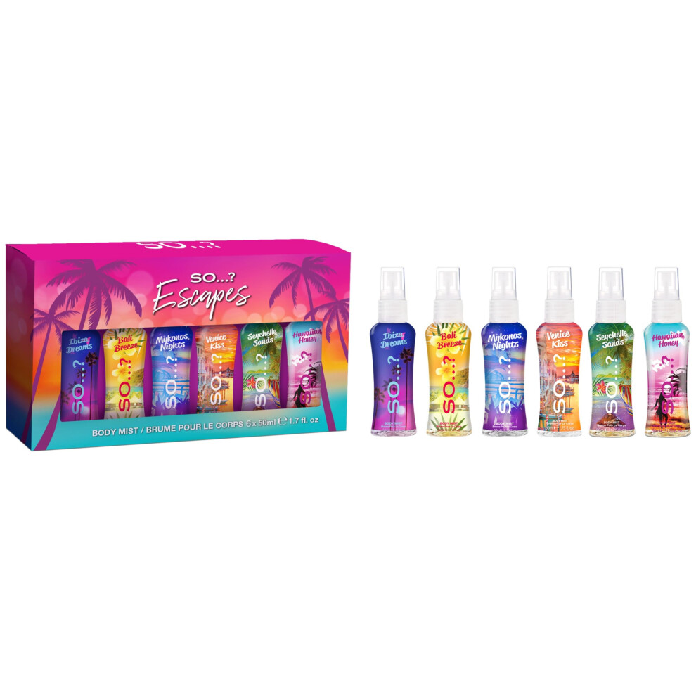 So…? Escapes Grande Womens Gift Set with Ibiza Dreams, Bali Breeze, Mykonos Nights, Santorini, Seychelle Sands, Hawaiian Honey, Body Mist Fragrance Spray Set (6 x 50ml.)§