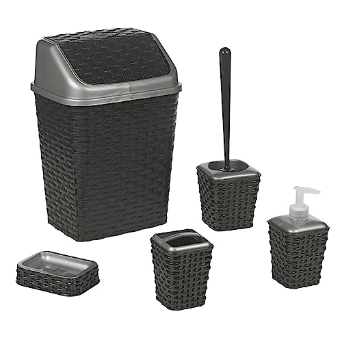 URBNLIVING 5 Pc Rattan Bathroom Bin Toilet Bowl Brush Toothbrush Soap Dispenser Holder Set (Black)