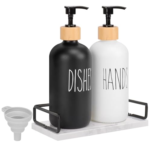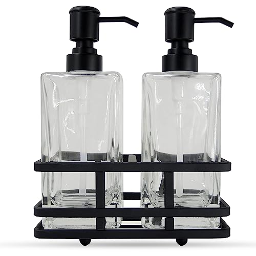 Luxury Glass Hand and Dish Soap Dispenser Set by Brighter Barns - Kitchen Soap Dispenser Set with Tray for Kitchen, Home or Restaurant - Modern Farmhouse Kitchen Decor (Black/White)