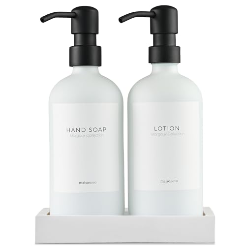 MaisoNovo Bathroom Soap and Lotion Dispenser Set of 2, 500ml White Glass Soap Dispenser and Black Pumps With Concrete Tray and Labels