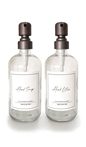 Clear Glass Soap Dispensers - Silver Stainless Steel Pump - Hand Soap and Lotion Dispenser Set - Glass Kitchen Soap Dispenser Set - 500ml - Bathroom Soap Dispensers - Waterproof Labels