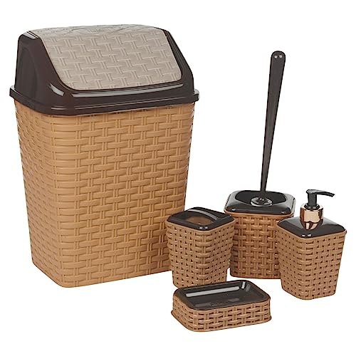 URBNLIVING 5 Pc Rattan Bathroom Bin Toilet Bowl Brush Toothbrush Soap Dispenser Holder Set (Brown)