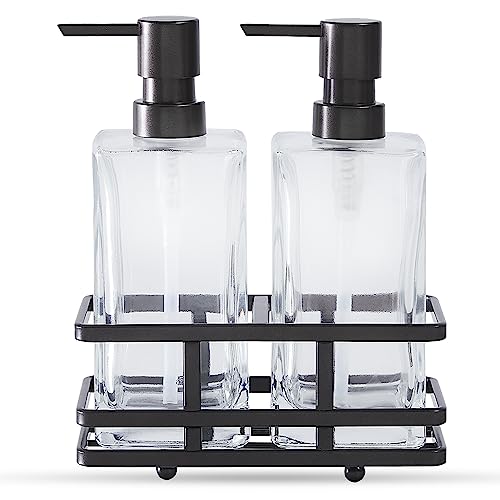 Square Glass Clear Lotion and Soap Pump Dispenser Set with Metal Stand Caddy for Bathroom Bath Kitchen Home Office Travel Hotel Hand Crafted Heavy Weight (Oil Rubbed Bronze)