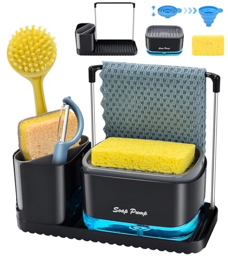 Bestseek Hand & Dish Soap Dispenser Set w/Tray, Dual Soap Dispenser w/Sponge Holder & Dishcloth Holder 5-in-1 Organizer Kitchen Sink Countertop Storage Organize - Useful Kitchen Gadgets (Black)
