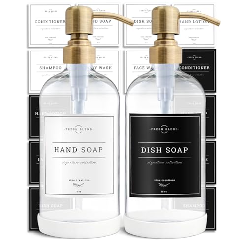 Vine Creations Clear Glass Soap Dispenser, 2 Pack Kitchen Soap Dispenser Set with Rustproof Pump, 16 oz Dish Soap and Hand Soap Dispensers for Bathroom with Waterproof Labels