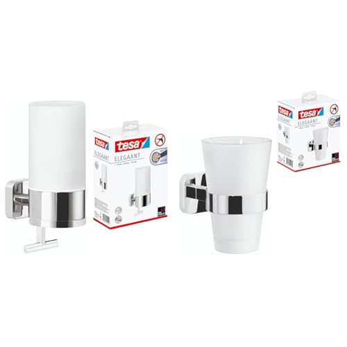 tesa ELEGAANT soap dispenser set - liquid soap dispenser for wall mounting without drilling, incl. adhesive solution + tesa ELEGAANT toothbrush tumbler with holder - chrome-plated wall bracket