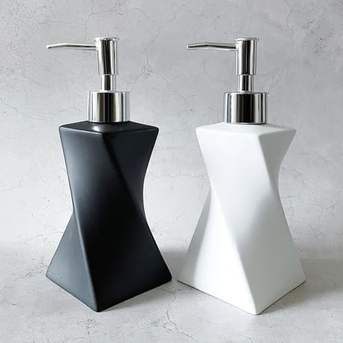 2 Pack Modern White & Black Soap Dispenser Set with Silver Pump for Bathroom and Kitchen, Contemporary Art Style, Matte Finish, Rust Proof, 8.5oz