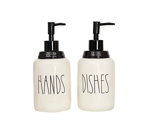 Cam n Honey Modern Farmhouse Style Ceramic Dishes and Hands Liquid Soap Dispenser Set – Perfect for Kitchen Counter Décor (14oz, White Bottles with Black Pump and Lettering)…