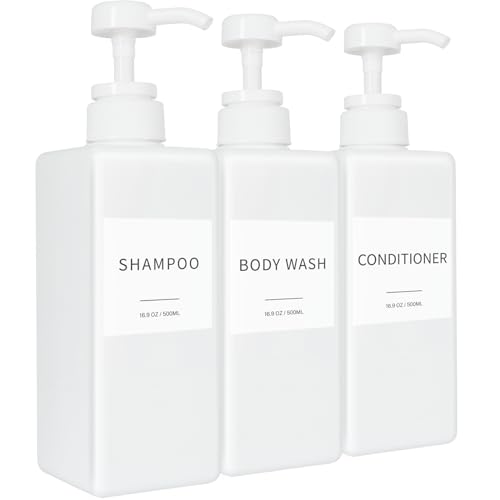 Shampoo and Conditioner Dispenser, Refillable Plastic Shampoo Pump Bottles with Waterproof Labels, Empty Body Wash Dispenser Set for Bathroom, Shower Soap Dispenser (White, Set of 3, 16.9oz)