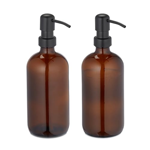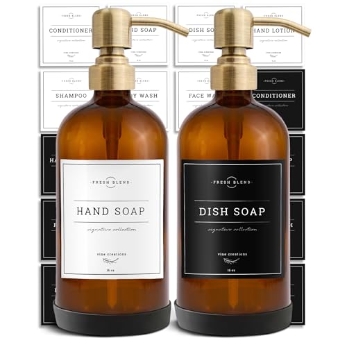 Vine Creations Amber Glass Soap Dispenser, 2 Pack Kitchen Soap Dispenser Set with Stainless Steel Pump, 16 oz Dish Soap and Hand Soap Dispensers for Bathroom with Waterproof Labels