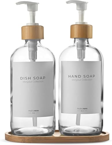 MaisoNovo Bathroom Soap and Lotion Dispenser Set of 2, 500ml Clear GLass Soap Dispenser Bamboo Pumps With Labels and Bamboo Tray