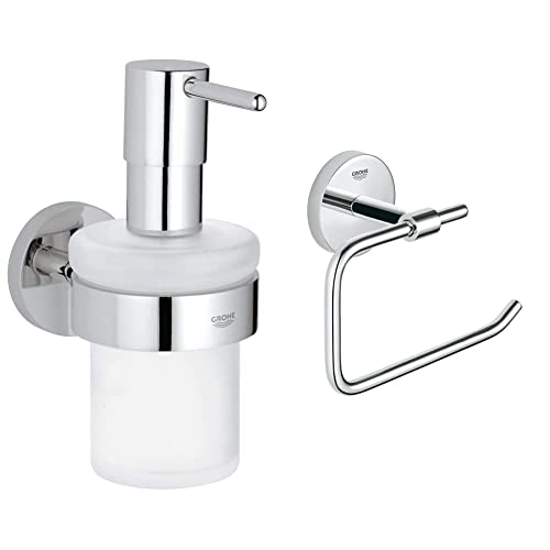 GROHE Essentials Holder with Soap Dispenser Set –, Suitable for Gluing, Chrome, 40448001 & BauCosmopolitan Toilet Paper Holder, Suitable for Gluing, Chrome, 40457001